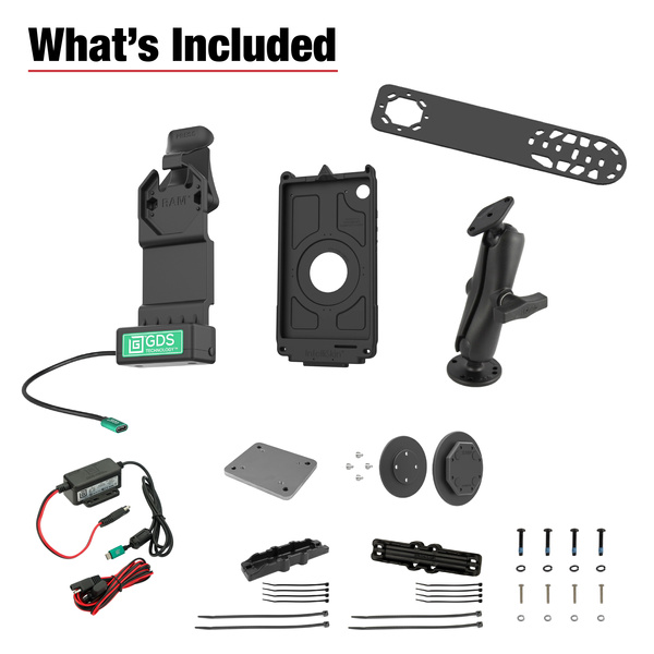 - Bundle includes GDS® Uni-Conn™ dock, Uni-Conn™ adapter, IntelliSkin® for the Samsung Tab A9, a microphone bracket, hardwire charger, and a double ball mount with backing plate