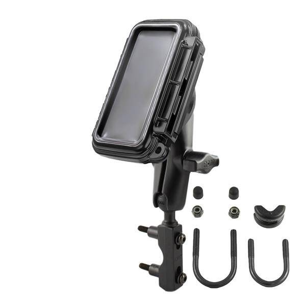 The RAM-B-174-AQ3U consists of a hardware for mounting to both brake/clutch reservoirs and rails that are 0.5" to 1.25" in diameter, double socket arm, 2.5" diameter round bases with the universal AMPS hole pattern and sealed enclosed small size AQUA BOX. The mount is designed with a RAM 1" diameter patented rubber ball and socket system that has adjustment points at both ends of the double socket arm; this allowing for almost infinite adjustment and perfect viewing angles. The AQUA BOX case provide sealed enclosure and protection for your handheld device. The clear, touch through screen allows you to view your electronics as well as use their function keys while in place. There is even a place for a small lock to serve as a theft deterrent. The mounting hardware for brake/clutch reservoirs include both standard and metric mounting bolts. BrandSymbolRAM-B-174-AQ3UProducer code793442908330SeriesProduct Weight231 gHardware IncludedAssembly Hardware|(2) M6 x 55mm Hex Bolts|(2) #1/4-20 x 2" Hex Bolts|(2) 1/4"-20 x 2.5" Hex Bolts|(2) 1/2" Spacers|(2) 1/4" Split Lock Washers|(1) 1/4"-20 U-Bolt for .5" - 1" Rails|(1) 1/4"-20 U-Bolt for 1" - 1.25" Rails|(2) 1/4"-20 Nylock Nuts|(2) RubberInternal DimensionsWidth: 2.38"|Height: 4.63"|Depth: 1.13"Clamp Range.5" - 1.25" diameterSocket-to-Socket Length3"Weight CapacityStandard Use: 907.18 gramss|Heavy-Duty Use: 453.59 gramsMaterialsMarine-grade aluminum|High strength compositePackaging TypePoly BagMounting TypeHandlebar/RailBrake/Clutch ReservoirBall & Socket SizeB Size 1" (Holds 907.18 gramss)Socket Arm LengthMedium ArmDiameter Range.5" - 1.25"Device or Accessory TypePhoneGPSVehicle TypeMotorcycleComponent partsRAM-B-174-202URAM-HOL-AQ3USocket To Socket Length3"Ball SizeB Size (1") - CompatibilitySmall Cell Phones