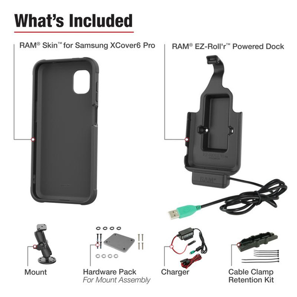 The RAM EZ-Roll'r Dock & Dashboard Mount for Samsung XCover6 Pro (RAM-B-101-225B2-SAM84-V7B1U) is a comprehensive kit of everything needed to deploy the Samsung XCover6 Pro in your fleet. It contains one RAM EZ-Roll'r dock, RAM Skin for the XCover6 Pro, and double ball mount with backing plate. The dock uses a USB Type-A female power connector and integrated pogo pins to provide power to the device while docked. It also features an easy docking and undocking process, simply place the device into the base of the dock and push it to snap into place. When undocking, a simple push the lever upwards to release the device. The RAM EZ-Roll'r Dock is backed by a 3-year warranty. BrandSymbolRAM-B-101-225B2-SAM84-V7B1UProducer code793442025877SeriesProduct Weight739 gHardware IncludedAssembly Hardware|(1) 2.10" x 2.60" Steel Backing Plate|(4) #8-32 x 1" Screws|(4) #8 Split Lock Washers|(4) #8 Flat WashersSocket To Socket Length3"Ball SizeB Size (1")Weight CapacityStandard Use: 907.18 gramss|Heavy-Duty Use: 453.59 gramsMaterialsSteel|Marine-grade aluminum|High strength compositePackaging TypePoly BagInput Voltage10-30VDCOutput Voltage5-9VDCOutput Current2.5A maxOperating Temperature-10°C to +70°CStorage Temperature-40°C to +70°CRegulatoryOvervoltage/Load Dump Compliance: Meets SAE J-1113CertificationsIntegrated Short Circuit Protection|FCC, Industry Canada, CE, WEEE, E-Mark and RoHS Compliant USB 2.0 BC 1.2 DCP SupportComponent partsRAM-B-103-238URAM-B-202-225-2URAM-GDS-CAB-CLAMP2URAM-GDS-CHARGE-V7B1URAM-HOL-SAM84CP-1URAM-SKIN-SAM84RAM-B-138U-225B2 - CompatibilitySamsung Galaxy XCover6 ProSamsung Galaxy XCover7 Pro