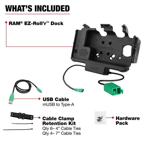 The RAM EZ Roll'r Modular Dual USB Dock for Samsung Tab Active5 & Tab Active3 (RAM-HOL-SAM60PD2NU) was thoughtfully designed to meet the demands of commercial truck drivers, field service technicians, pupil transporters, logistics managers, forklift operators, and more. Power and data sync capabilities are provided to the device through GDS pogo pins while taking advantage of this cradle's dual USB port to support up to two additional peripherals, making this the ideal, compact mounting solution for your mobile workstation. This modular dock is compatible with the RAM Skin or factory device skin along with most RAM accessories including: Temperature Control Accessories, RAM NFC Extender, and side bracket accessory attachments. Modular docks are not compatible with the GDS Hand-Stand but are compatible with the GDS Roto-Mag. Access to the stylus remains while the device is docked. Included is a set of four nuts and bolts to connect the dock to any RAM components containing the universal AMPS hole pattern. Also included is the mUSB female pigtail, GDS USB 2.0 cable, cable clamp, and zip ties. BrandSymbolRAM-HOL-SAM60PD2NUProducer code793442016165SeriesProduct Weight413 gHardware Included(4) #8-32 x 5/8" Machine Screws|(4) #8-32 Nylock Nuts|(1) GDS® Genuine USB 2.0 Straight Cable|(1) Optional Cable Clamp Housing|(4) Large Cable Ties|(6) Small Cable TiesHole Pattern4-Hole AMPS: 1.181" x 1.496"MaterialsHigh strength compositePackaging TypePoly BagInput Voltage4.4-5.4VDC (USB power source dependent)Output Voltage4.4VDC-5.4VDC (USB power source dependent)Power Output500mA per USB portInput ConnectormUSB FemaleInput Cable Length214mmOutput Connector(2) USB 2.0 Type AOutput Cable Length217mmComponent partsRAM-GDS-CAB-CLAMP1URAM-GDS-CAB-MUSB2-2UPeripheral Output900mAh (per port) - CompatibilitySamsung Tab Active3Samsung Tab Active5