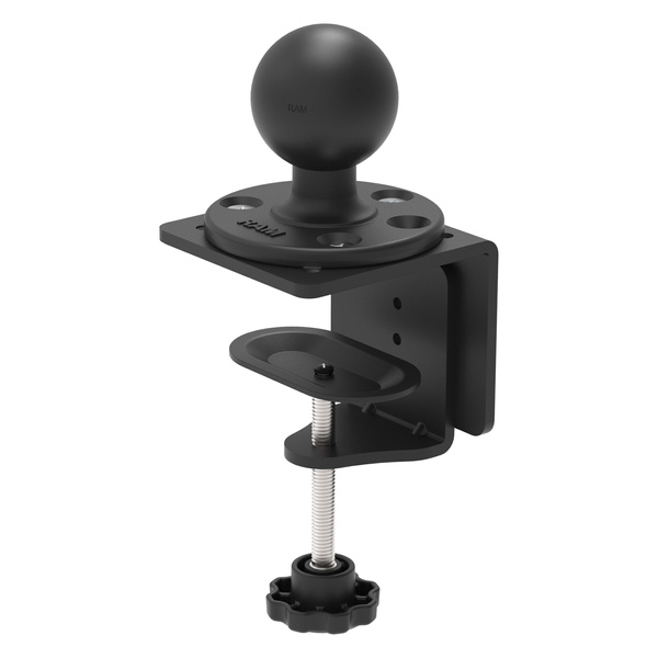 The RAM Heavy Duty C-Clamp Base with D Size Ball (RAM-D-202U-CC1) is a rugged, steel clamp mount designed for flexible, non-permanent device installation across a wide variety of workspaces. Ideal for desks, tables, carts, or mobile stations, this clamp secures firmly to surfaces ranging from 0" up to 4" in thicknessno minimum edge depth required. Built for durability, the all-steel construction delivers long-lasting performance, while the padded interior safeguards mounting surfaces from scuffs or scratches. Whether in industrial settings or professional offices, this clamp provides a secure hold without compromising aesthetics. This heavy-duty desk clamp includes a D size RAM ball base for mounting your desired device. Additionally, a 2-hole AMPS pattern is located on the side of the clamp, providing a convenient mounting point for smaller mounting solutions like phones, tablets, scanners, and more. With its durable construction and multiple compatibility options, this C-clamp base supports everything from lightweight tablet mounts to heavy-duty docking stations. The tool-less adjustment knob allows for fast installation and easy removal, making it perfect for temporary workstations, demo stations, or environments where adaptability is key. BrandSymbolRAM-D-202U-CC1Producer code793442029592NewYesHardware IncludedAssembly Hardware|(4) #8-32 x 5/8" Screws|(4) Nylon SpacersClamp Range0" - 4"Hole Pattern4-Hole AMPS: 1.181" x 1.496"Ball SizeD Size (2.25")Weight CapacityStandard Use: 2721.55 gramss|Heavy-Duty Use: 2267.96 gramssMaterialsMarine-grade aluminumPackaging TypePoly BagComponent partsRAM-CC1URAM-D-202U - Recommended products
