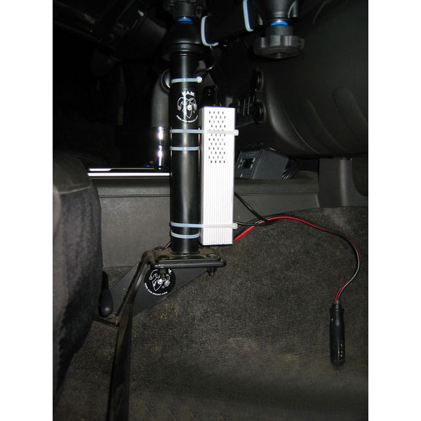 - Custom laptop vehicle mount installs using passenger seat bolts; no drilling required