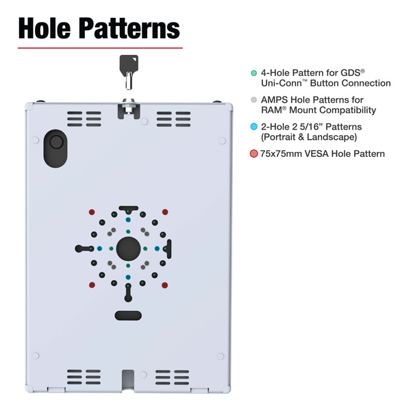 The RAM Safe-Case for Apple iPad 10th & 11th Gen - Gray (RAM-TE-AP40-GRY) is a rugged, modular enclosure designed for high-security environments. Built from durable two-piece steel, this key-locking tablet case protects against theft, tampering, and tough environmental conditionsideal for demanding field or industrial applications. Custom-fit for the iPad 10th & 11th Gen, the Safe-Case features precision cutouts for full access to the devices lock button, USB-C port, and rear camera. Ventilation slots and speaker openings maintain device functionality without compromising protection. The smooth gray finish not only blends well into professional and industrial settings but also adds a clean, modern aesthetic. The enclosure features versatile mounting options with integrated hole patterns for flush mounting, compatibility with RAM double ball mounts, or 75x75mm VESA stands. For added docking functionality, the Safe-Case supports the installation of a GDS Uni-Conn buttonenabling rear pogo pin charging when paired with any compatible GDS dock (look for the octagon icon on product listings). BrandSymbolRAM-TE-AP40-GRYProducer code793442028465Hardware IncludedAssembly Hardware|(4) #8-32 x 1/2" Machine Screws|(4) #8-32 Nylock Nuts|(4) #10-24 x 1/2" Machine Screws|(4) #10-24 x 5/8" Machine Screws|(4) #10-24 Nylock Nuts|(2) #6-32 x 3/4" Machine Screws|(2) #6 Fender Washers|(1) 90 Degree USB-C CableProduct DimensionsOverall Height: 9.7" Overall Width: 6.62" Overall Thickness: .79"Packaging TypeBoxProduct Weight1433 g - CompatibilityApple iPad 10th GenApple iPad 11th Gen