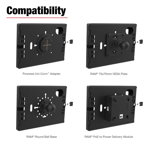 The RAM Safe-Case for Apple iPad mini (A17 Pro) & mini 6 (RAM-TE-AP36) is a rugged, modular enclosure designed for high-security environments. Built from durable two-piece steel, this key-locking tablet case protects against theft, tampering, and tough environmental conditionsideal for demanding field or industrial applications. Custom-fit for the Apple iPad mini, the Safe-Case features precision cutouts for full access to the devices lock button, USB-C port, and rear camera. Ventilation slots and speaker openings maintain device functionality without compromising protection. The enclosure features versatile mounting options with integrated hole patterns for flush mounting, compatibility with RAM double ball mounts, or 75x75mm VESA stands. For added docking functionality, the Safe-Case supports the installation of a GDS Uni-Conn buttonenabling rear pogo pin charging when paired with any compatible GDS dock (look for the octagon icon on product listings). BrandSymbolRAM-TE-AP36Producer code793442028335SeriesHardware IncludedAssembly Hardware|(4) #8-32 x 1/2" Machine Screws|(4) #8-32 Nylock Nuts|(4) #10-24 x 1/2" Machine Screws|(4) #10-24 x 5/8" Machine Screws|(4) #10-24 Nylock Nuts|(2) #6-32 x 3/4" Machine Screws|(2) #6 Fender Washers|(1) 90 Degree USB-C CableProduct DimensionsOverall Height: 9.7" Overall Width: 6.62" Overall Thickness: .79"Packaging TypeBoxProduct Weight1098 g - CompatibilityApple iPad mini (A17 Pro)Apple iPad mini 6