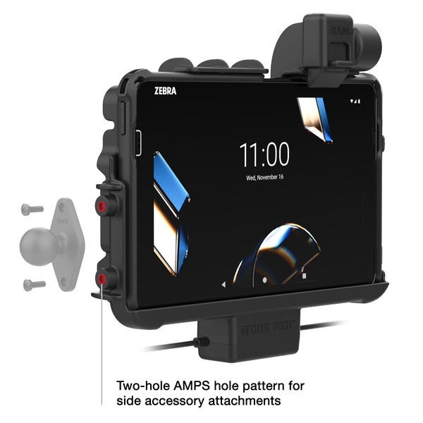 The RAM Thin-Dock + Dual USB for Zebra ET401 & ET4x 10" (RAM-HOL-ZE47PD2U) delivers a low-profile, 2.45"-deep design reinforced with a durable metal plate, ideal for applications where space is limited. This vehicle dock is purpose-built for the Zebra ET401, ET40, and ET45 10" enterprise tablets, connecting directly to the tablet's integrated pogo pins to ensure a reliable, long-lasting mounting and charging solution. Engineered for efficiency, the Thin-Dock keeps your tablet powered through pogo pin contacts while docked, with power supplied via the docks USB Type-C connector. Connect up to two peripheral devices such as a mouse, keyboard, or printer using the peripheral dual USB-A connector. The design also maintains access to the tablets side scanning function, making it a strong fit for field service, warehousing, retail, transportation, and other data-capture environments. Because of its compact footprint, this dock does not support add-ons like the Zebra Expansion Back or PowerPack Battery. For mounting flexibility, the dock is compatible with both RAM C and D size 4-hole AMPS pattern bases, ideal for pairing with a double socket arm to complete your vehicle or workstation setup. This dock also features integrated attachment points for the RAM Vent-Temp, a temperature control accessory, and the RAM NFC Extender. Enhance your workflow further using the integrated 2-hole mounting plate, compatible with RAM 2-hole diamond bases, allowing you to mount an additional device such as a phone, handheld scanner, or other accessories. BrandSymbolRAM-HOL-ZE47PD2UProducer code793442032479SeriesNewYesHardware Included(4) #8-32 x 5/8" Machine Screws (4) #8-32 Nylock Nuts (4) #10-24 x 5/8" Machine Screws (4) #10-24 Nylock Nuts (1) Cable ClampHole Pattern75 x 75mm VESA|4-Hole AMPS: 1.181" x 1.496"MaterialsHigh strength compositePackaging TypePoly BagOutput Voltage12V @ 2APower Output24WInput Connector5.5mm DC ConnectorInput Cable Length1 MeterOutput Connector(2) USB 2.0 Type AOutput Cable Length225mmPeripheral Output900mAh (per port)Transfer Speed12MbpsCertificationsRoHS|WEEE|CE|FCC|IC|RCM - CompatibilityZebra ET401 10"Zebra ET40 10"Zebra ET45 10"