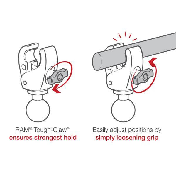 - Small version of the RAM® Tough-Claw™ base is designed to quickly clamp to round, square, and odd-shaped rails and bars ranging from .625" to 1.14" in outer diameter; rubber pads provide stable gripping and protection of mounting surface