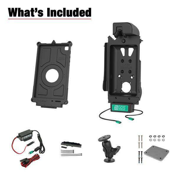 - Zestaw zawiera GDS® Tough-Dock™, IntelliSkin® Next Gen dla Samsung Tab A7 Lite 8.7", GDS® Modular 10-30V Hardwire Charger, podwójny uchwyt kulowy C Size z krótkim ramieniem, adapter płyty tylnej i zacisk kablowy.