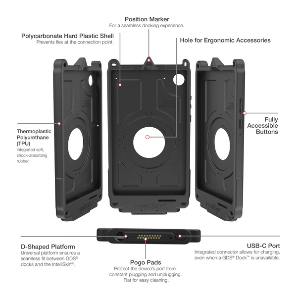 - Złącze GDS® i styki dokujące zapewniają możliwość ładowania i synchronizacji danych; uniwersalny znacznik pozycjonujący kompatybilny ze stacjami dokującymi IntelliSkin® Next Generation