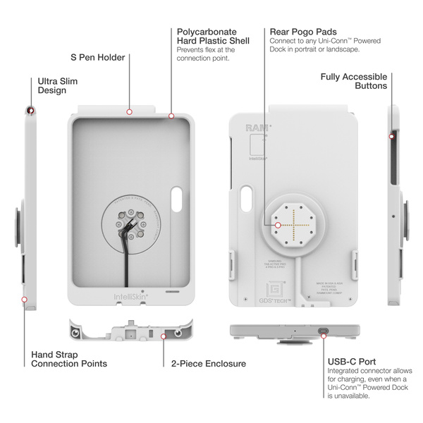IntelliSkin Thin-Case for Samsung Tab Active5 Pro (Rear Pogo Pads) - Gray (RAM-GDS-SKIN-SAM100-TCB-GRY) to niskoprofilowa, dwuczęściowa obudowa zaprojektowana dla platformy dokującej GDS Uni-Conn. Styl połączenia GDS integruje złącze USB-C, które prowadzi przez obudowę do pogo padów zintegrowanych z adapterem GDS Uni-Conn. Wytrzymała powłoka z poliwęglanu chroni urządzenie przed codziennym zużyciem, a kompletna obudowa utrudnia nieautoryzowanym użytkownikom dostęp do tabletu, zapewniając dodatkowy spokój dla tabletów zamontowanych w miejscach o dużym natężeniu ruchu. Płaskie, wzmocnione styki pogo pad są przeznaczone do wielokrotnego dokowania w celu ochrony portu USB-C urządzenia i zbierają mniej brudu, co ułatwia ich czyszczenie. Zintegrowane złącze USB typu C w dolnej części obudowy umożliwia ładowanie urządzenia, nawet jeśli nie masz dostępnej stacji dokującej GDS Powered Uni-Conn Dock. Etui IntelliSkin Thin-Case with Rear Pogo Pads dla tabletu Samsung Tab Active5 Pro jest kompatybilne wyłącznie ze stacjami dokującymi GDS Powered Uni-Conn, które można łatwo rozpoznać po emblemacie GDS Powered Uni-Conn Adapter. Jasnoszara estetyka jest idealna do wyrafinowanych, jasnych miejsc pracy w branżach takich jak handel detaliczny, medycyna i nie tylko. Jedna stacja dokująca do podłączenia wszystkich urządzeń. Zawsze chroniony. Zawsze połączony. MarkaSymbolRAM-GDS-SKIN-SAM100-TCB-GRYKod producenta793442031663NowośćTakMateriałyKompozyt o wysokiej wytrzymałościTyp opakowaniaWorek foliowyPrędkość transferuUSB 2.0 przy 480 Mb/sPortyZewnętrzny port USB-C 2.0 - KompatybilnośćSamsung Tab Active ProSamsung Tab Active4 ProSamsung Tab Active5 Pro