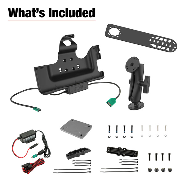 - Zestaw zawiera stację dokującą RAM® Powered Dock, uchwyt mikrofonu, ładowarkę przewodową i podwójny uchwyt kulowy z płytą montażową.
