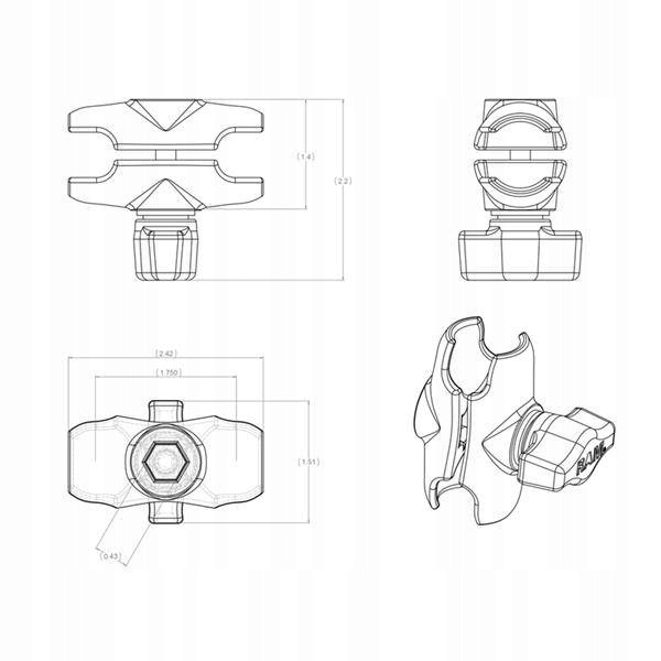 - Mocowanie do dowolnego elementu kulowego RAM® w rozmiarze B, w tym do podstaw montażowych i uchwytów urządzeń; technologia podwójnej kuli i gniazda umożliwia niemal nieograniczoną regulację systemu montażowego RAM®.